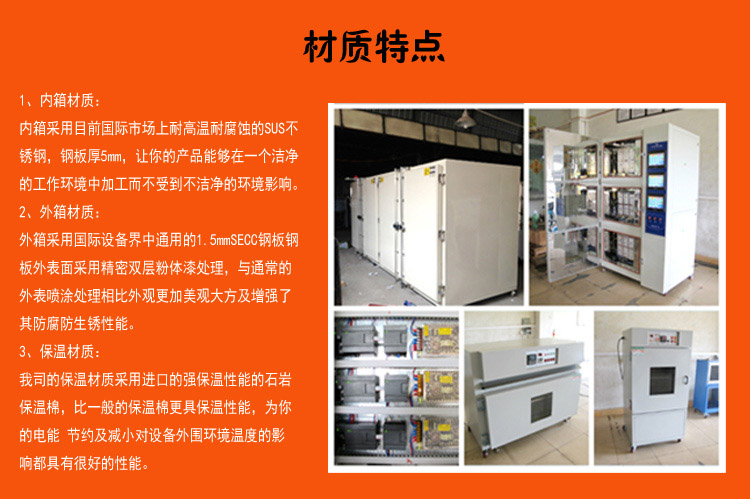 1、内箱材质: 内箱采用目前国际市场上耐高温耐腐蚀的SUS不锈钢,钢板厚5mm,让你的产品能够在一个洁净的工作环境中加工而不受到不洁净的环境影响。2、外箱材质:外箱采用国际设备界中通用的1.5mmSECC钢板,钢板外表面采用精密双层粉体漆处理,与通常的外表喷涂处理相比外观更加美观大方及增强了其防腐防生锈性能。3、保温材质:我司的保温材质采用进口的强保温性能的石岩保温棉,比一般的保温棉更具保温性能,为你的电能 节约及减小对设备外围环境温度的影响都具有很好的性能。